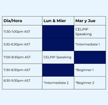 Las clases de inglés se imparten dos veces por semana. Los cursos de CELPIP pueden realizarse dos o cuatro veces por semana, dependiendo de las necesidades del estudiante.