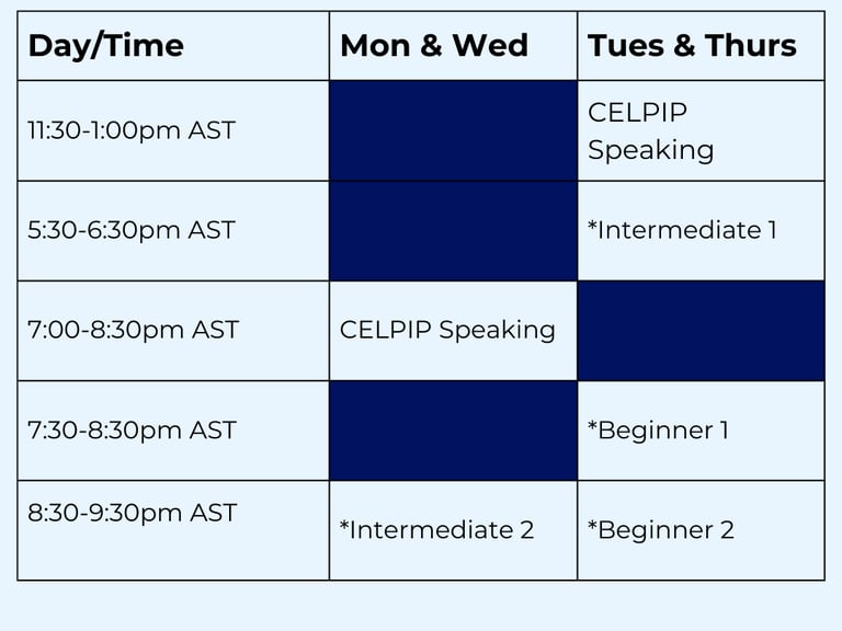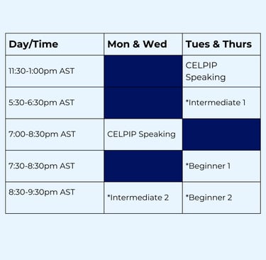 English classes run twice per week, CELPIP can be twice per week or four times per week, depending on student requirements. Please contact us or consult the schedule for more information.