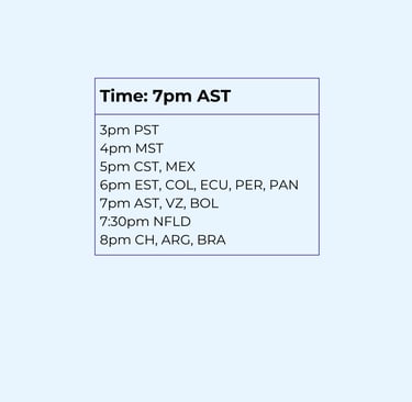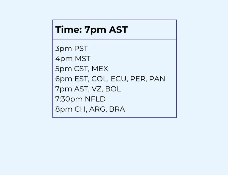 Please note that all class times are listed in AST on the schedule. Use the chart to confirm your time zone and compare with class times.
